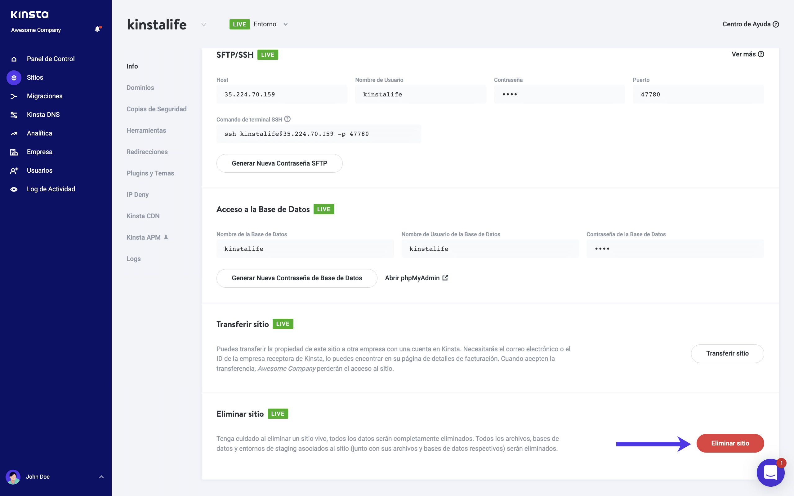 - Desplázate hasta el final de la página y haz clic en «Eliminar tu sitio permanentemente»