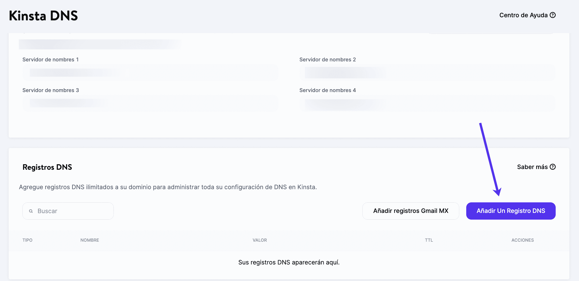 Desplázate hacia abajo para localizar la sección de Registros DNS. Haz clic en el botón Añadir un registro DNS.