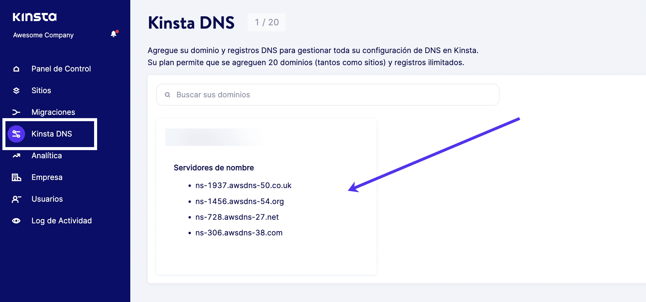 En MyKinsta, completa esto yendo a Kinsta DNS y eligiendo el dominio que quieres utilizar.