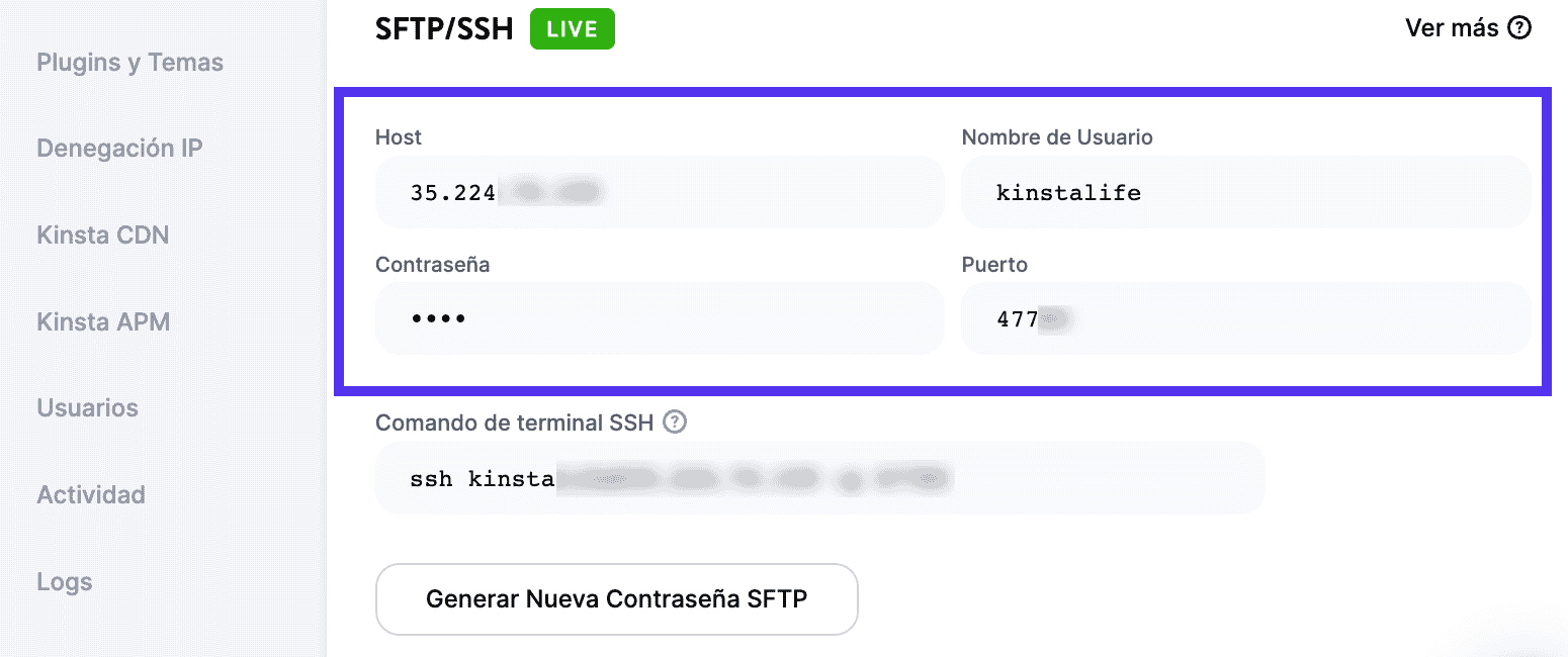 Elige la pestaña Información (que ya debería estar seleccionada por defecto) y desplázate hasta la sección SFTP/SSH.