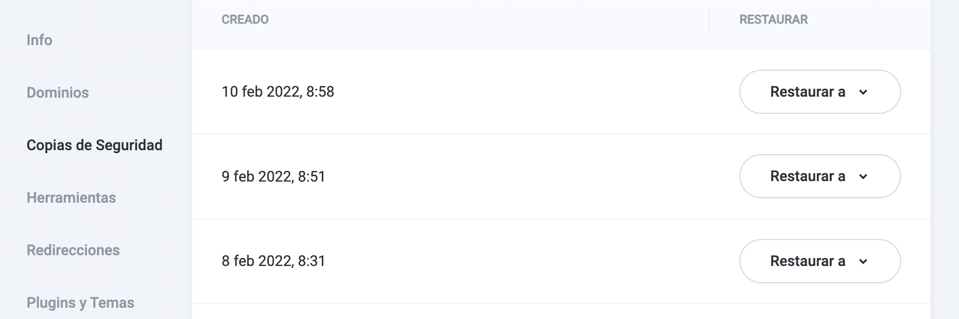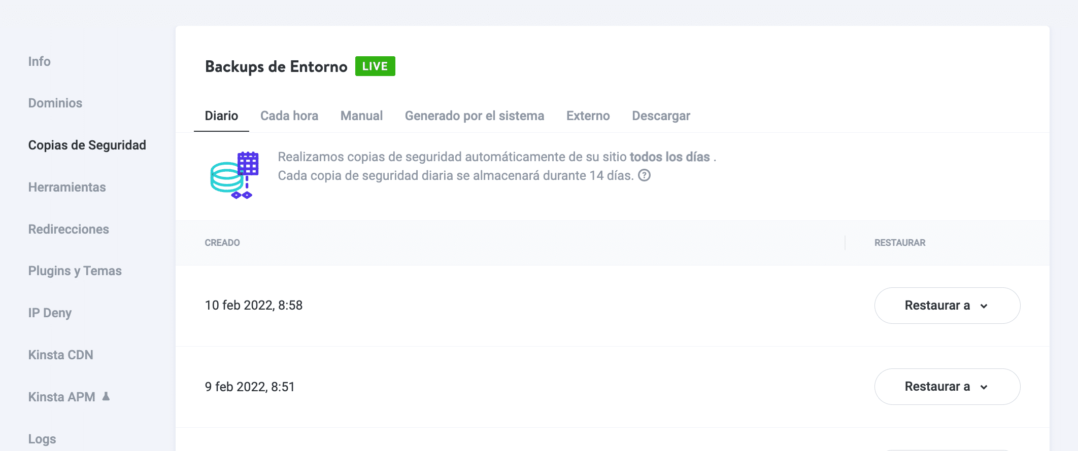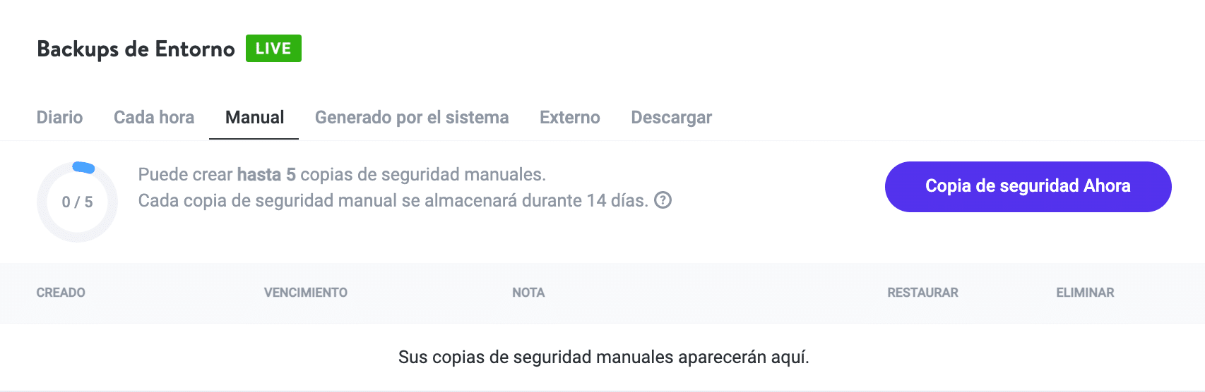 Puedes crear hasta cinco copias de seguridad manuales, que el sistema almacenará durante un máximo de 14 días. Es una función valiosa que puedes utilizar justo antes de realizar actualizaciones importantes en tu sitio web.