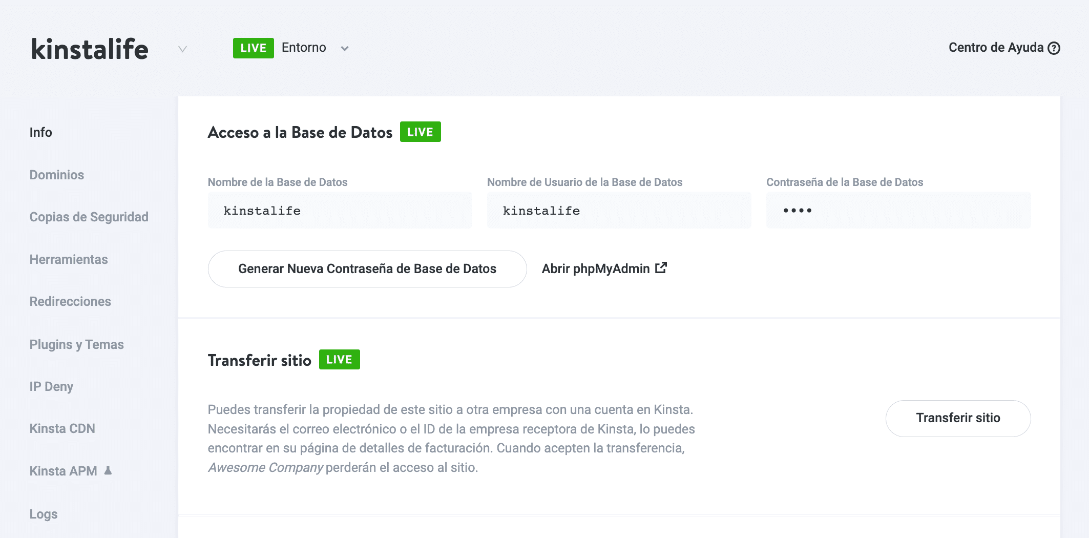 Si utilizas Kinsta, puedes acceder a tu base de datos entrando en el panel de control de tu cuenta de alojamiento (MyKinsta si eres usuario de Kinsta), seleccionando un sitio web y navegando hasta la pestaña de Información: