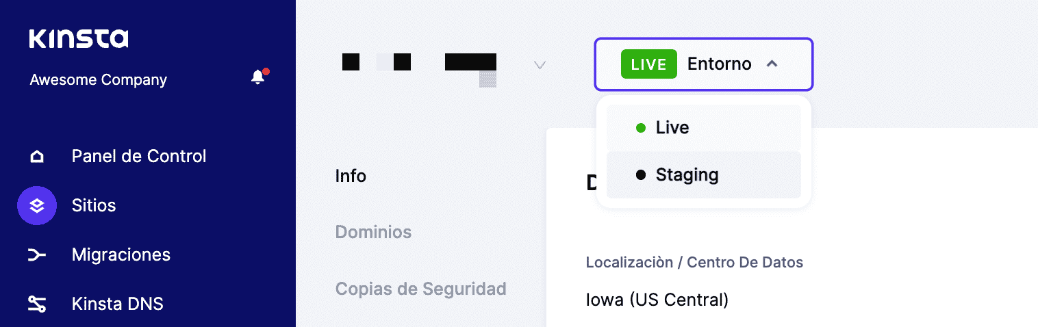 Algunos alojamientos web te proporcionan acceso a la funcionalidad de staging desde su panel de control. Si utilizas Kinsta, puedes seleccionar tu sitio web mediante el panel de control de MyKinsta y alternar entre los entornos en producción y de staging: