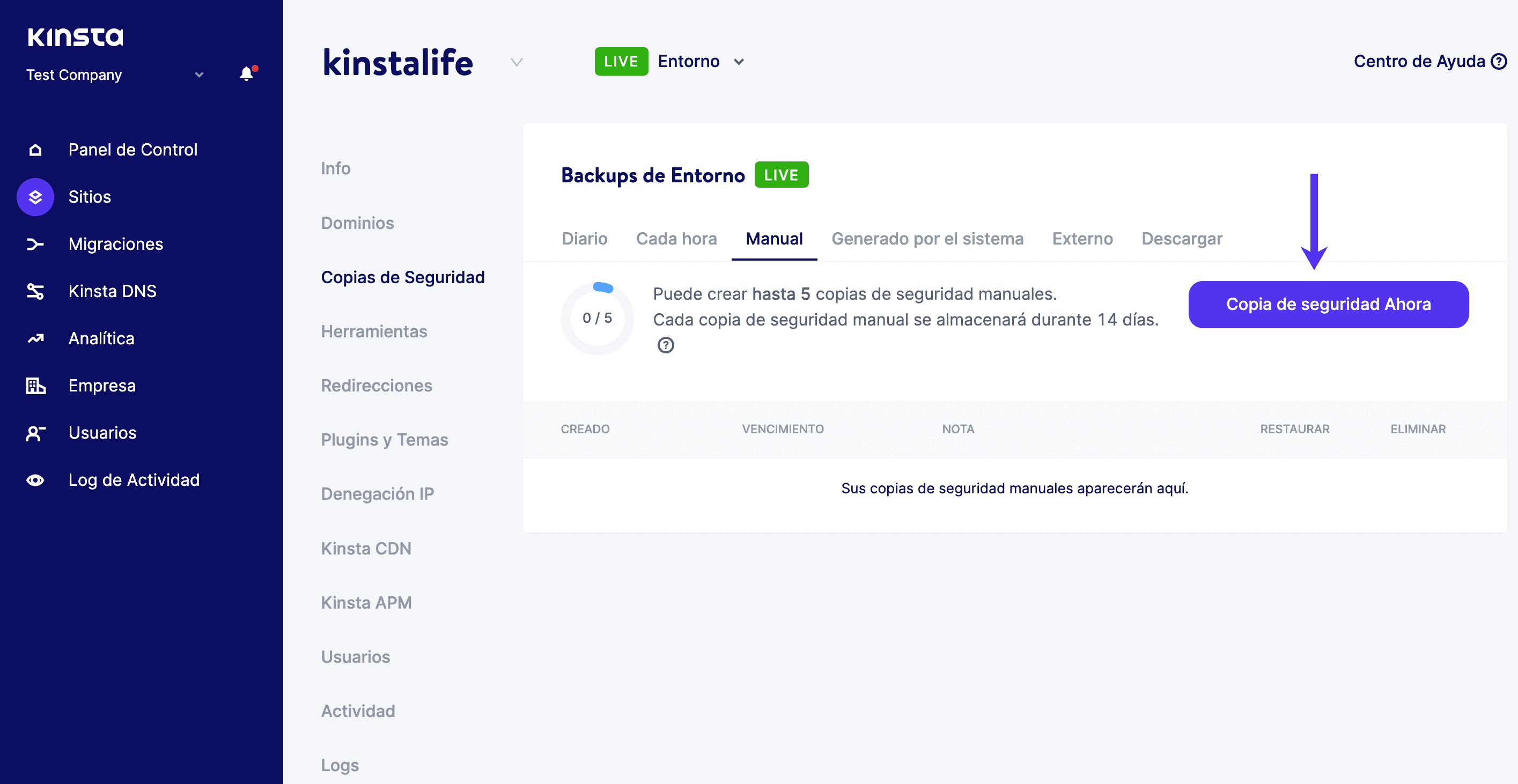 Si eres usuario de Kinsta, puedes aprovechar nuestra función de copia de seguridad con un solo clic. Haz clic en tu sitio de WordPress en MyKinsta, haz clic en «Copias de seguridad» y luego en «Hacer copia de seguridad ahora».