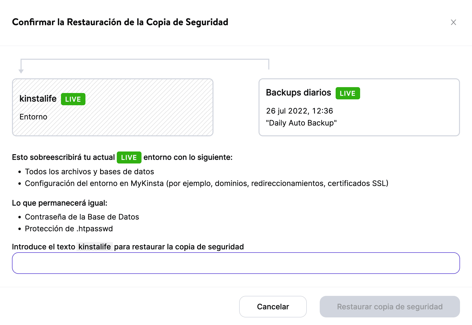 A continuación, se te pedirá que confirmes la restauración. Introduce el nombre de tu sitio y haz clic en «Aceptar» También crea una copia de seguridad en el momento de la restauración para que puedas deshacerla si es necesario.