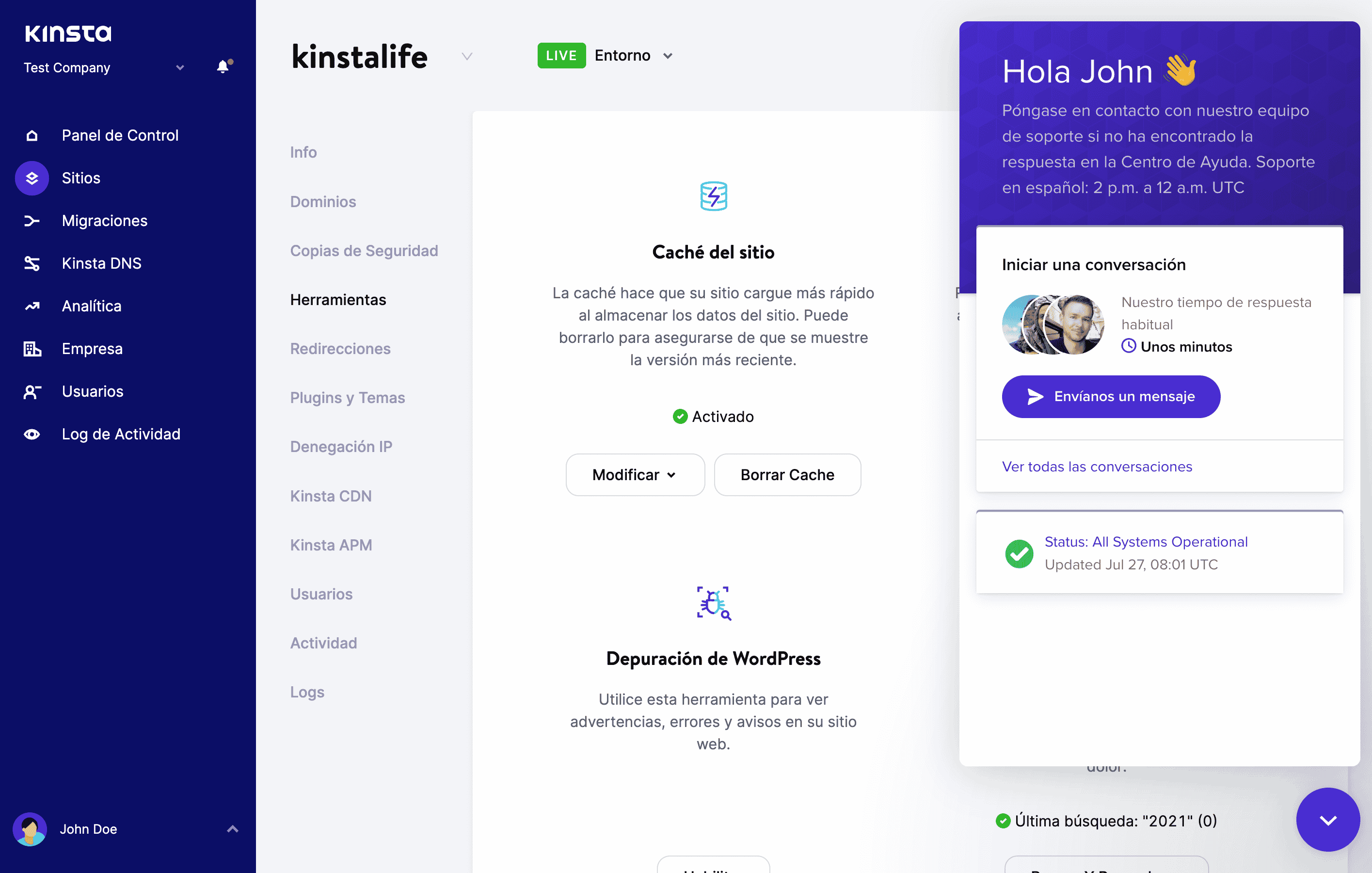 El experto equipo de soporte de Kinsta está siempre a un clic de distancia en la parte inferior derecha del panel de control y está disponible las 24 horas del día si necesitas ayuda. Y no olvides que tenemos especialistas para ayudarte en varios idiomas, incluyendo inglés, español, francés, italiano y portugués.