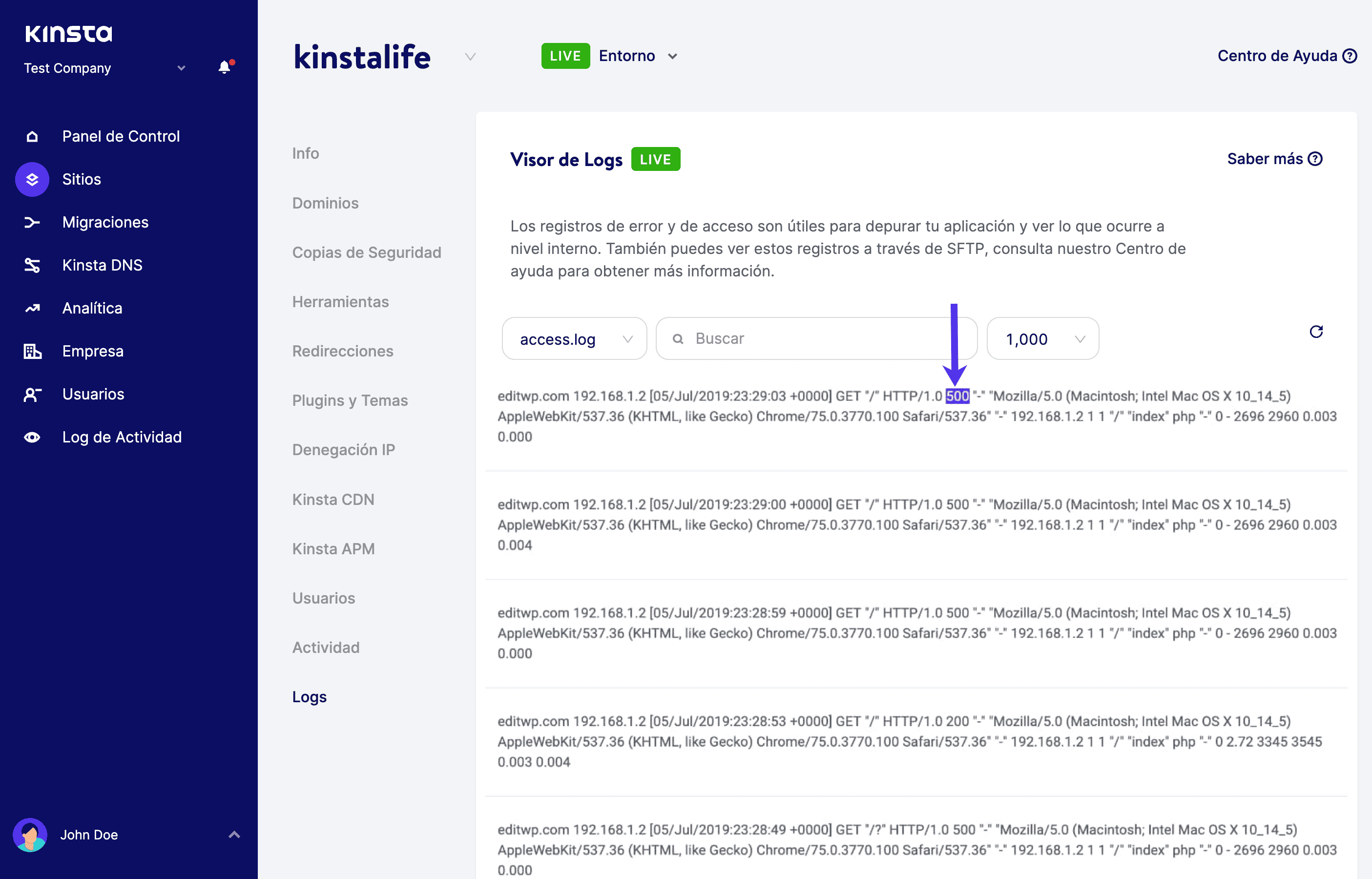 Cuando los visitantes intenten acceder a tu sitio mientras se produce este error, se generará un código de estado HTTP 500 en tus registros. Este mismo código de estado aparece con un «error interno del servidor» Significa que algo ha ido mal en el servidor, y el recurso solicitado no se ha entregado. Cuando todo funcione correctamente, tu sitio generará un código de estado HTTP 200, lo que significa que todo está bien.