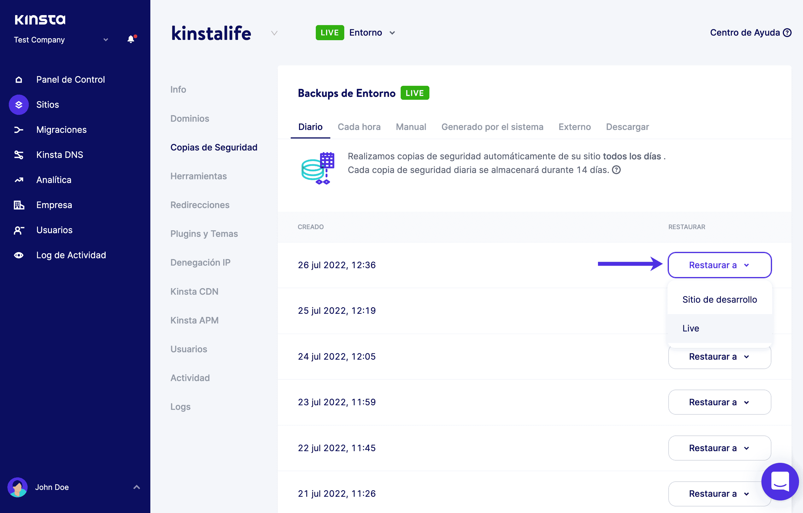 Si eres usuario de Kinsta, puedes restaurar una copia de seguridad de tu sitio rápidamente dentro de la sección Copias de seguridad de tu sitio. Elige el momento en que quieres restaurar y haz clic en «Restaurar a». Luego puedes seleccionar si quieres restaurar a Staging o a tu sitio En Producción.