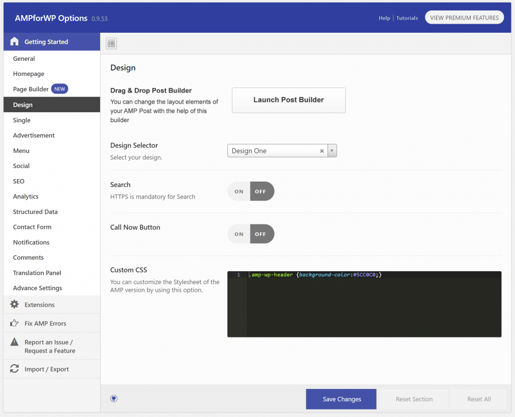 Bajo la pantalla diseño puede lanzar post builder o seleccionar un esquema prediseñada. Puede activar HTTPS para búsqueda y también agregar el botón «Call now». Hay una opción a CSS personalizado. En nuestro sitio por ejemplo añadimos el siguiente código para personalizar el color de la cabecera: