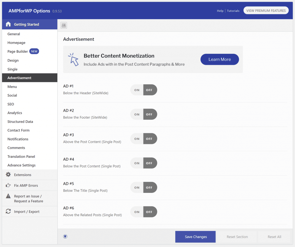 Si usted desea tener una manera fácil de agregar características adicionales, entonces aquí es donde el plugin gratuito AMP para WP entra en juego. Esto es básicamente una extensión del plugin oficial AMP y le ofrece características y soporte adicionales. Es desarrollado por Ahmed Kaludi y Mohammed Kaludi quienes también dirigen una exitosa tienda de plantillas de WordPress. Nota: Para usar esto, el plugin oficial de AMP es necesario.