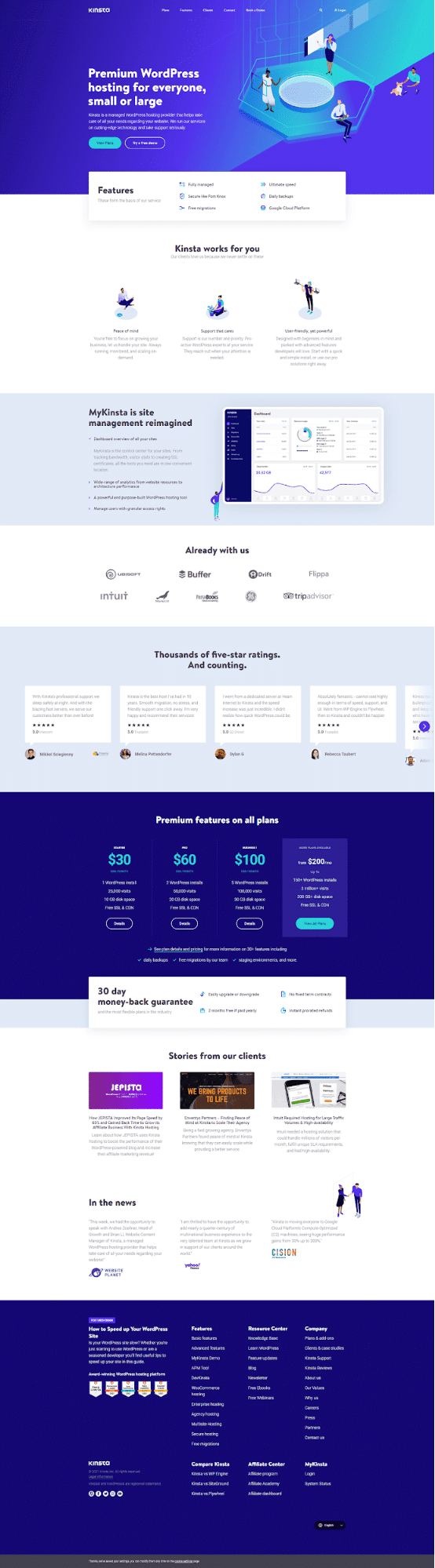 Una captura de pantalla a toda página de la página de inicio de Kinsta (haz clic para ampliar la imagen).