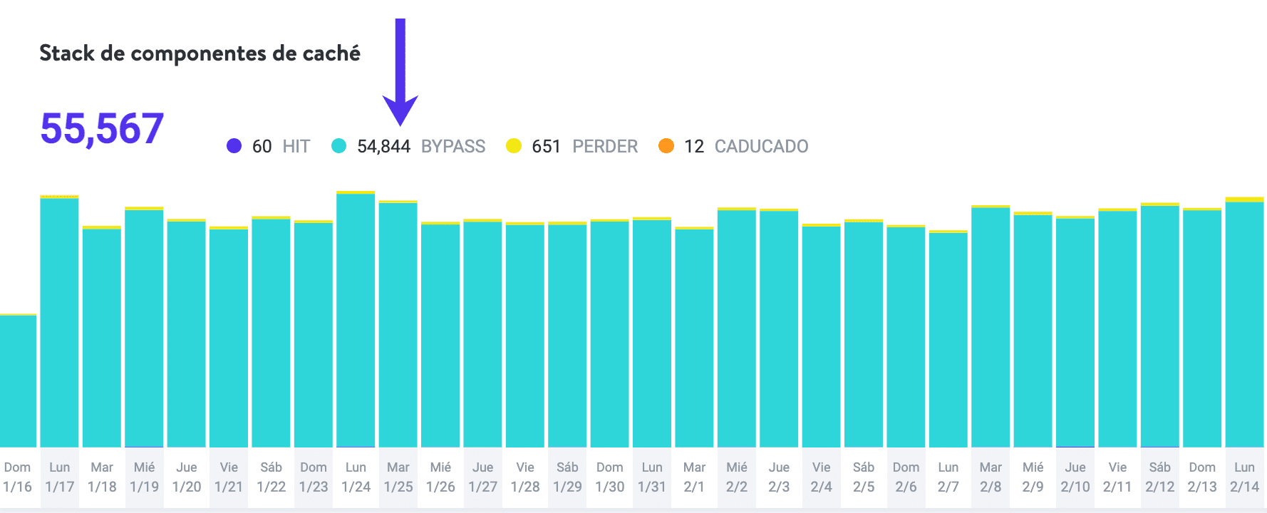 En la herramienta MyKinsta analytics que proveemos para los clientes de hosting, podrá ver cómo es el estado del contenido cacheado está. A continuación, veremos un ejemplo de un sitio donde la gran mayoría de las peticiones no están siendo servidas desde la cache.