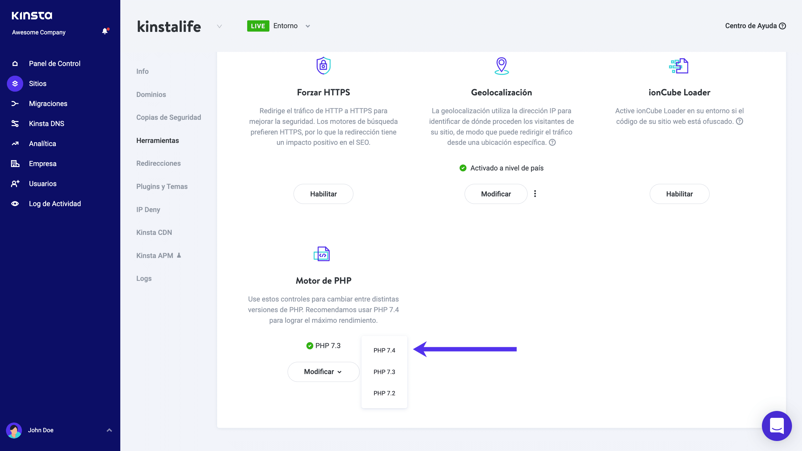 Si su host actual de WordPress no soporta PHP 7 o superior, quizás es tiempo de buscar un nuevo host. Kinsta está ofreciendo PHP 7.4 desde Noviembre de 2019, al igual que todas las demás versiones superiores. Puede fácilmente alternar entre estas dando un solo clic en el dashboard de MyKinsta. Ya ofrecemos PHP 7.3 para hacer pruebas.