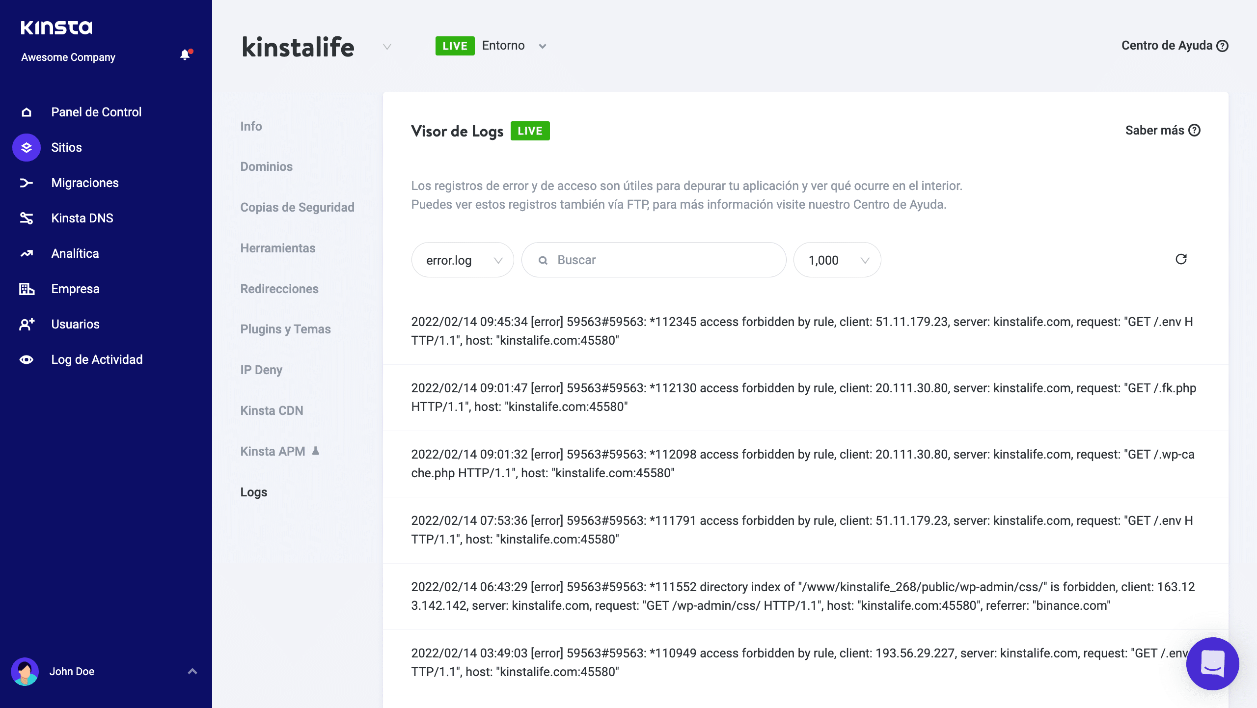 Otros, como aquí en Kinsta podrían tener un folder dedicado llamado “registros”.