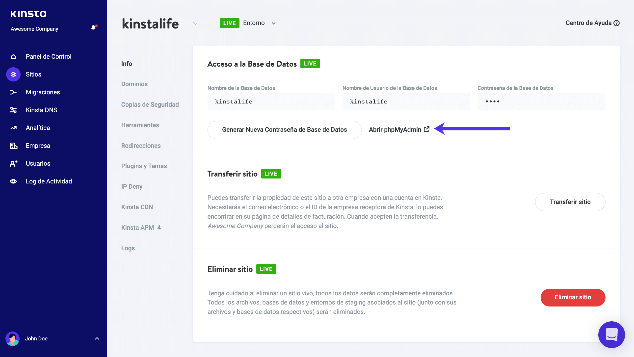 Por lo tanto, usted necesita tener acceso a la base de datos de WordPress al iniciar sesión a su phpMyAdmin. Si usted es cliente de Kinsta, este se puede encontrar dentro de la sección de “Info” en el dashboard de MyKinsta.