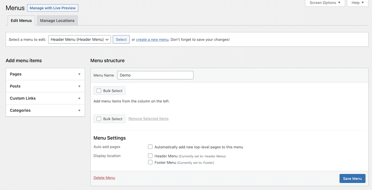 • La ubicación del menú. Cada tema tendrá sus ubicaciones de menú. A menos que modifiques los archivos principales de su tema, los desarrolladores del tema han codificado estas ubicaciones de los menús. Algunos temas pueden permitirte personalizarlos a través de su configuración.
