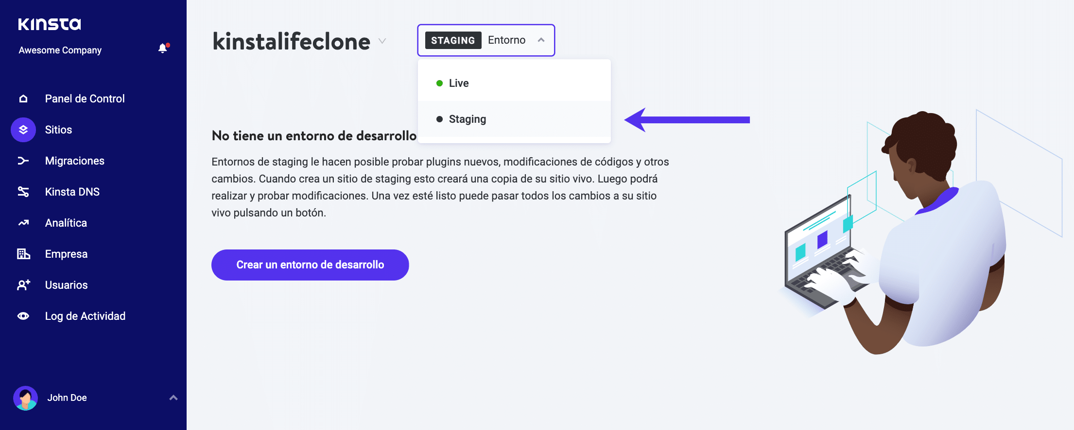 La manera más fácil de empezar a probar es crear un entorno de prueba, ya que se parecerá mucho a su sitio de producción en vivo. En el panel de control de MyKinsta, haga clic en su sitio y cambie a un entorno de prueba.