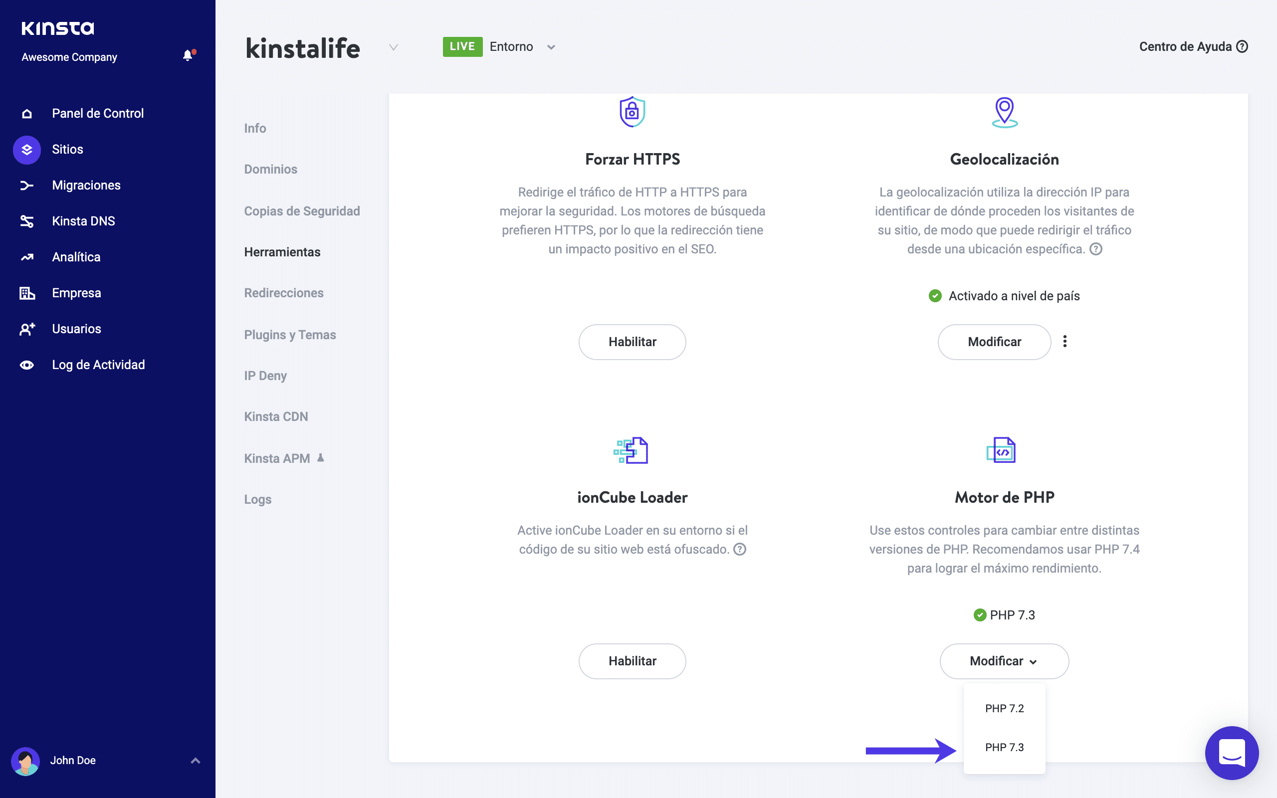 - El sitio está utilizando PHP 7.3. Las nuevas versiones de PHP siempre han mostrado grandes mejores de desempeño. Cheques estos puntos de referencia de PHP. Kinsta permite que pueda cambiar entre las diferentes versiones con tan sólo presionar un botón.