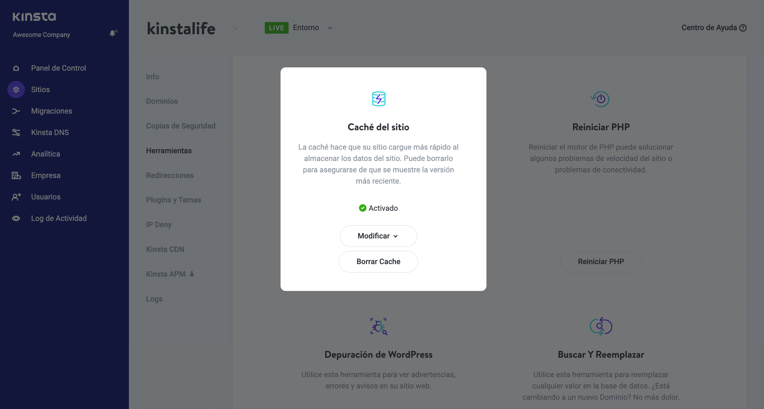 En MyKinsta, por ejemplo, debes navegar a tu sitio desde la pantalla de Sitios, y luego dirigirte a la pestaña de Herramientas. Aquí, verás la opción Caché del sitio:
