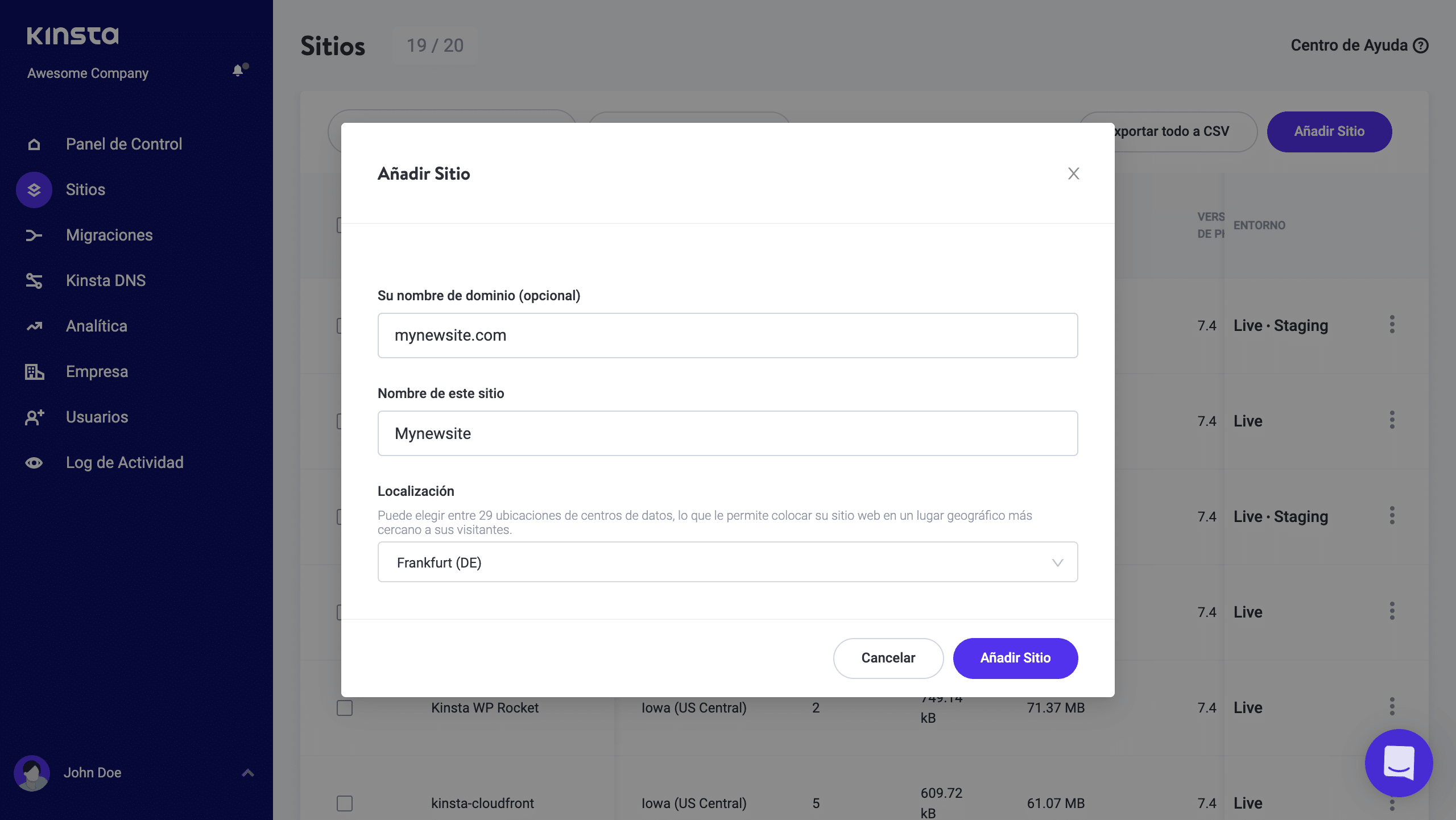 Usted puede borrar su viejo sitio y crear uno nuevo en el dashboard de Kinsta.
