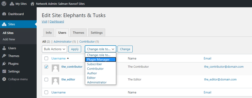 Como medida de seguridad, sólo los usuarios con capacidad para editar usuarios pueden cambiar de cuenta. De manera predeterminada, en una instalación de WordPress de un solo sitio sólo los administradores tienen esta capacidad, mientras que en una red de varios sitios sólo los superadministradores tienen esta capacidad.