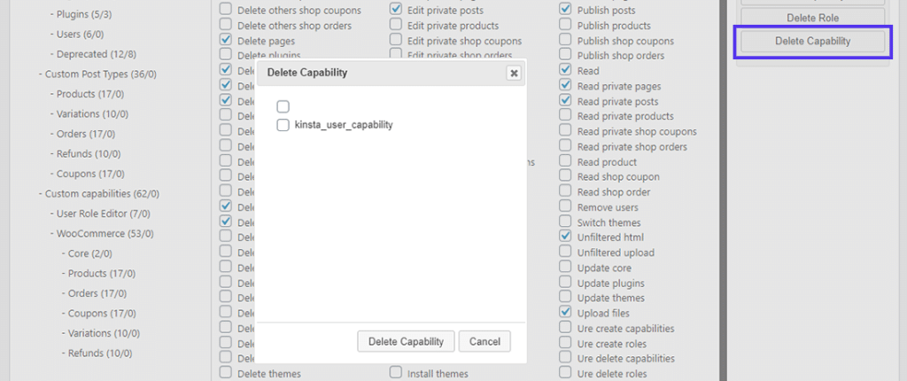 Debes tener en cuenta que el botón de capacidad de eliminación aparece sólo si alguna capacidad no está asignada a los no administradores. De lo contrario, se oculta.