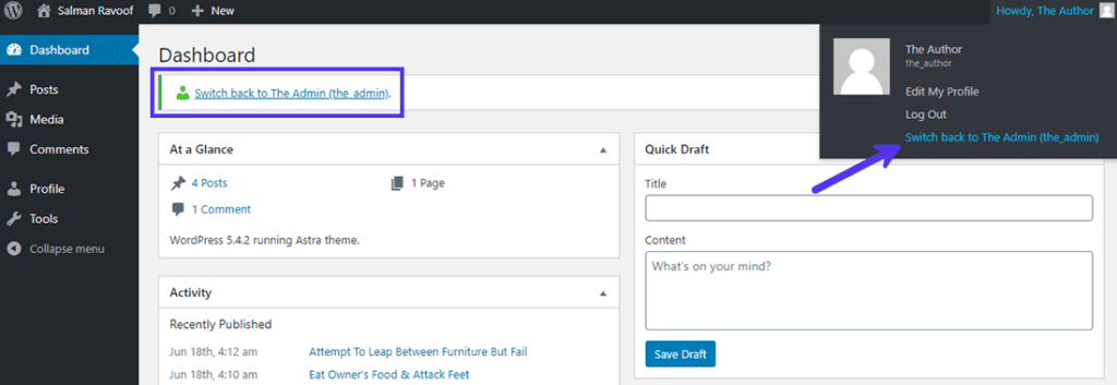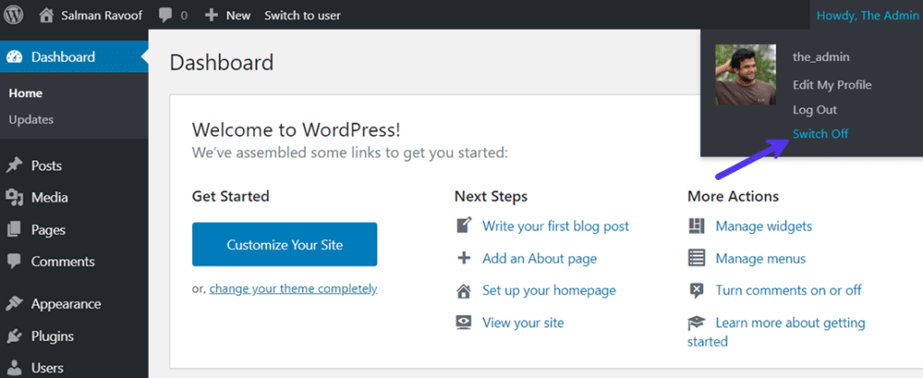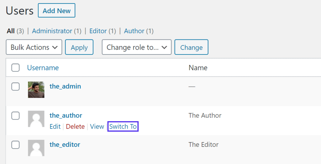 Después de instalar y activar el plugin, visita el menú de Usuarios en tu tablero. Verás un enlace «Cambiar a» para cada usuario. Si haces clic en él, cambiarás al usuario que desees.