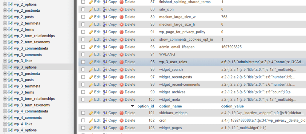 Nota: El prefijo wp_ puede ser diferente en su configuración. Depende del valor de la variable global $table_prefix en el archivo wp-config.php de tu sitio.