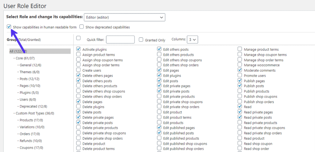 - Selecciona el rol que deseas personalizar en el menú desplegable. Aparecerán no sólo los roles predeterminados sino también todos los roles presentes en la base de datos. También puedes elegir mostrar las capacidades en forma legible para los humanos en lugar de sus constantes. Otra opción te permite ver las capacidades desaprobadas que ya no están soportadas en la última versión de WordPress.