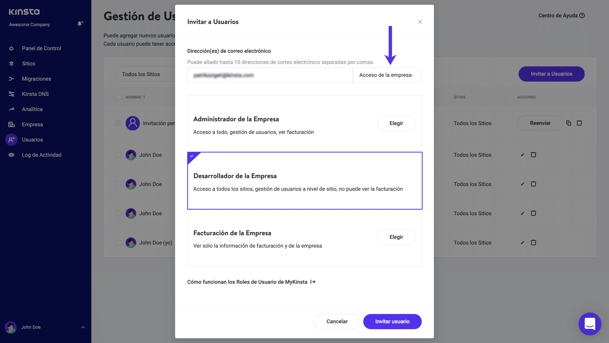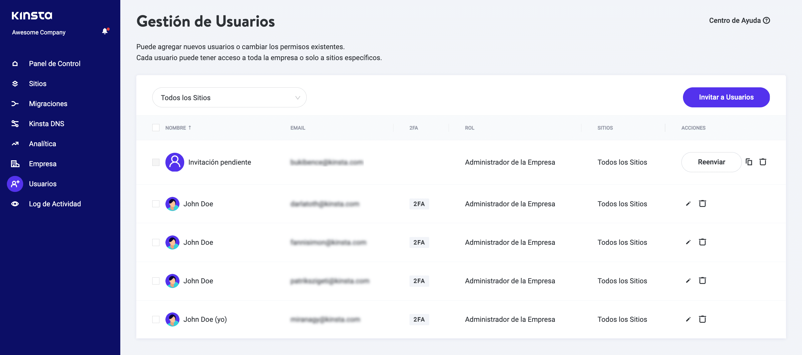 El papel de Administrador de la Compañía otorga el más alto nivel de acceso en MyKinsta. Le da al usuario un control completo sobre la cuenta de Kinsta y todos sus sitios. Debes dar este rol sólo a los usuarios en los que confíes.