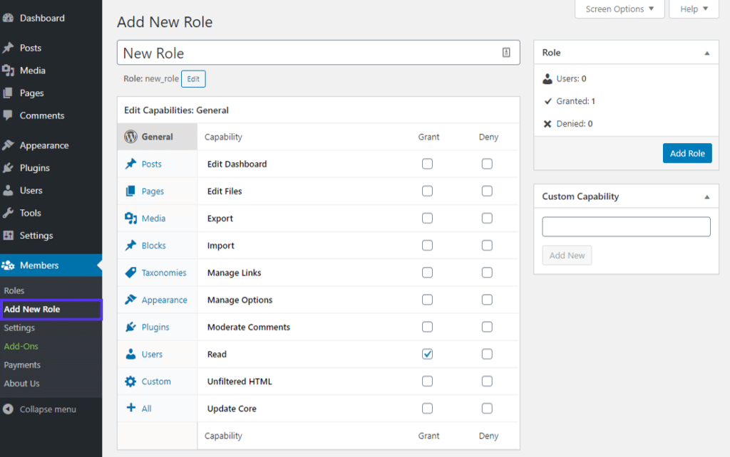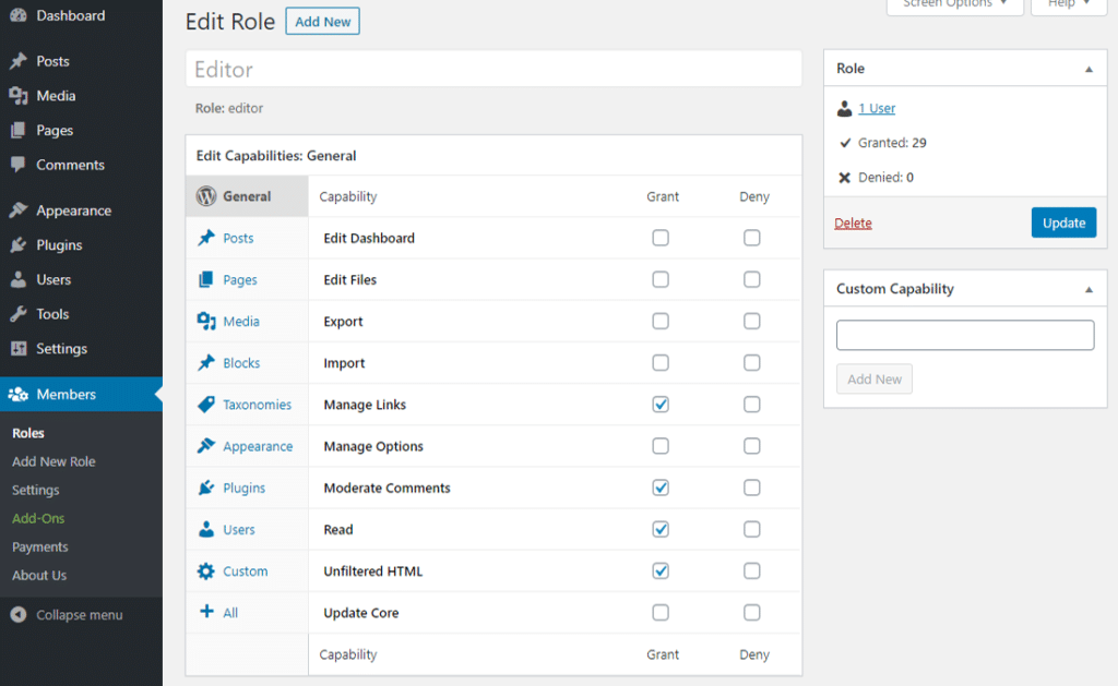 En el panel Editar función, puede conceder o denegar explícitamente capacidades a una función determinada marcando y desmarcando las casillas correspondientes. También puedes añadir una capacidad personalizada al rol desde aquí.