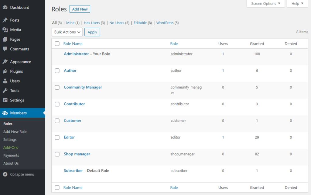 Después de instalar y activar el plugin, puedes ver todos los roles disponibles en tu sitio web yendo a Miembros > Roles en tu tablero.