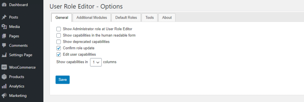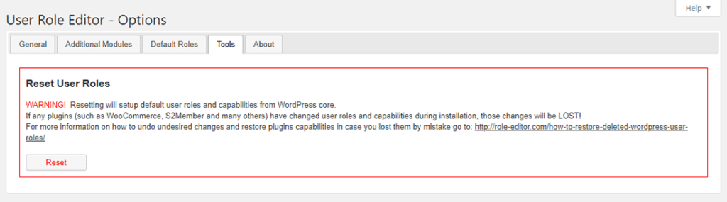 Si vas a Settings > User Role Editor en tu panel de administración, también encontrarás opciones adicionales para el plugin User Role Editor.