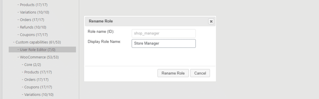 También puedes cambiar el nombre de la pantalla de la función haciendo clic en el botón Renombrar la función. Sin embargo, no puedes cambiar el ID de la función (o el nombre de la función). Una solución alternativa es duplicar el rol cuyo ID quieres cambiar y luego borrar el rol original.
