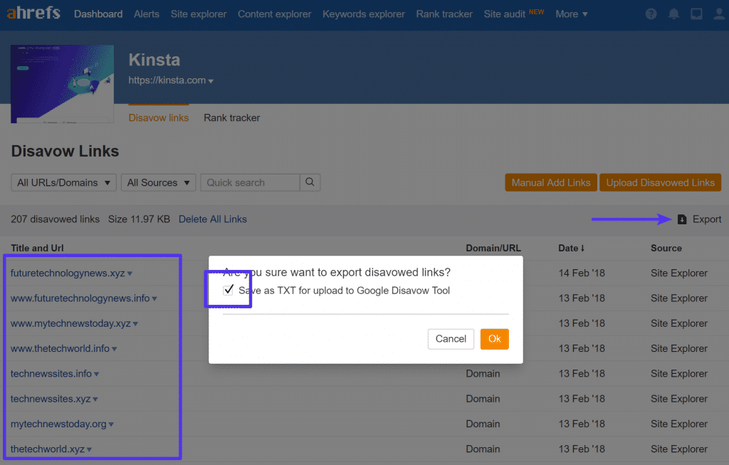 Como puede ver a continuación, agregamos todos los dominios de la granja de servidores de contenido a nuestra sección de enlaces de desautorización en Ahrefs. El siguiente paso es hacer clic en «Exportar» y obtener el archivo de denegación (TXT) que debemos enviar en Google Search Console.