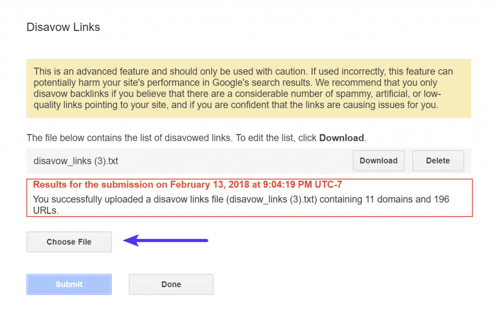 Elija su archivo de desautorización que haya exportado desde Ahrefs y envíelo. Esto sobrescribirá su archivo de desautorización anterior. Si no ha utilizado Ahrefs anteriormente y ya existe un archivo de desautorización, se recomienda descargar el actual, fusionarlo con el nuevo y luego cargarlo. A partir de ese momento, si solo está usando Ahrefs, simplemente puede cargar y sobrescribir.