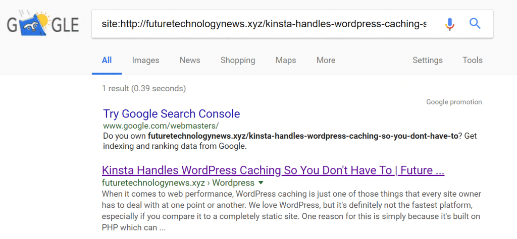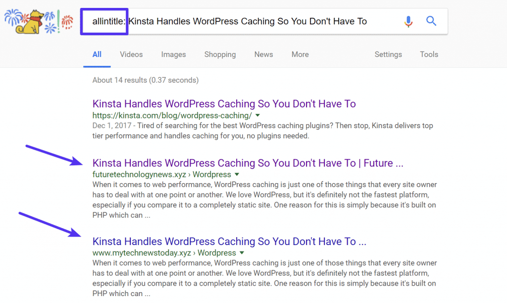 También puede buscar manualmente en Google usando la etiqueta «allintitle». Simplemente ingrese la etiqueta junto con el título de su publicación. Ejemplo: allintitle: Kinsta se encarga de la cache de WordPress para que usted no tenga que hacerlo