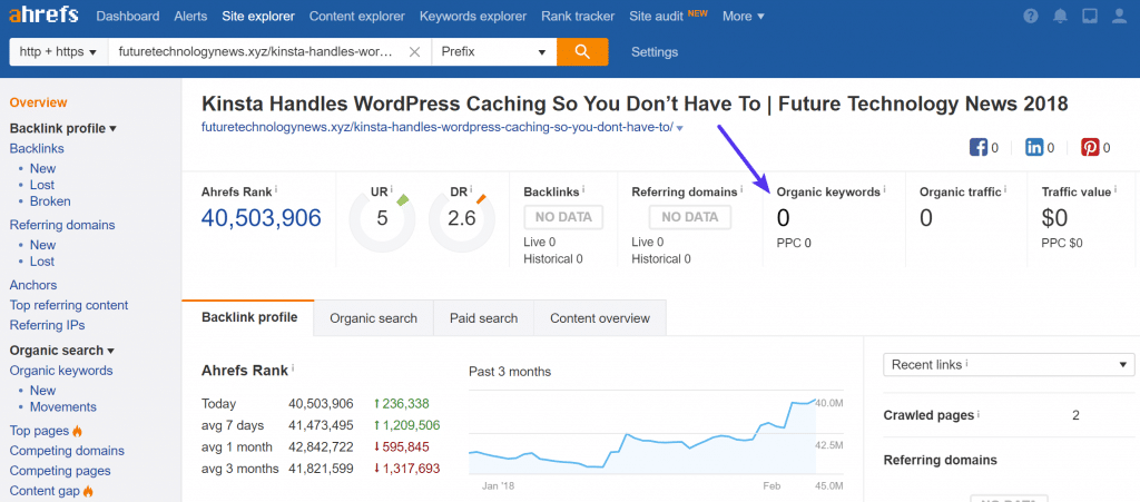 Esta persona revisó nuestra publicación de blog en noviembre de 2017, por lo que ha tenido tiempo de sobra para clasificar si fuera a hacerlo. Así que sacamos nuestra práctica herramienta Ahrefs y verificamos para qué palabras clave actuales están clasificadas sus publicaciones. Y podemos ver que no está clasificando para ninguna palabra clave. Por lo que respecta al tráfico orgánico, no se benefician de esta publicación en absoluto.