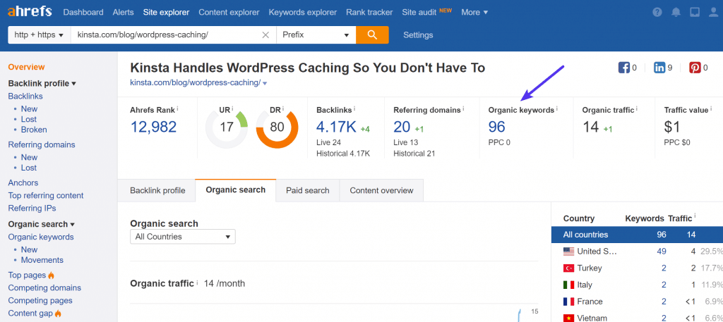 Si revisamos la publicación original de nuestro blog en Ahrefs, podemos ver que clasificamos con 96 palabras clave.