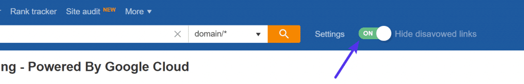 En Ahrefs, seleccionamos el dominio en cuestión y hacemos clic en «Desactivar dominios». Esto garantiza que todo lo que se encuentra en este sitio web no puede afectarnos.