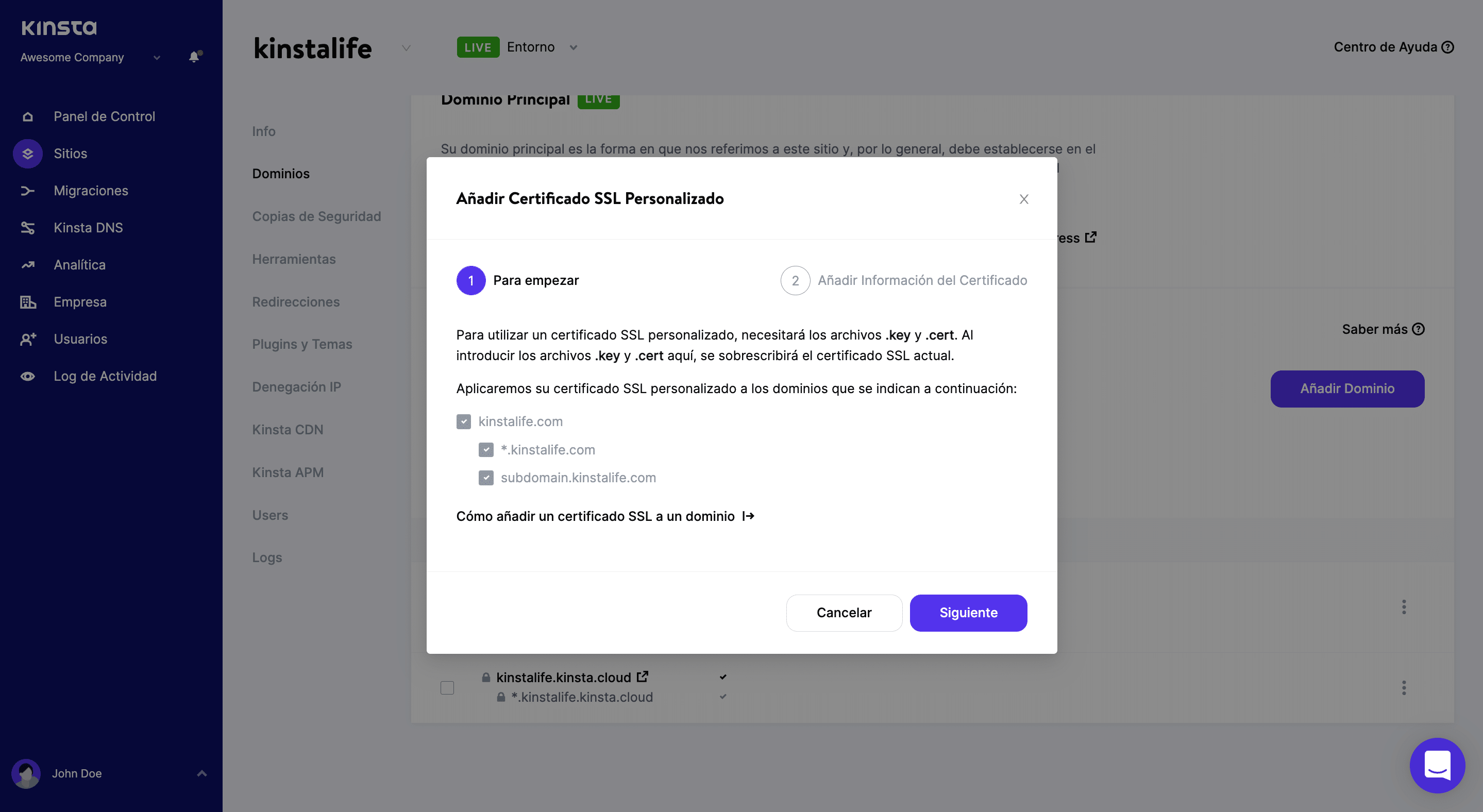 Si tu sitio web está alojado en Kinsta, está automáticamente protegido por nuestra integración con Cloudflare, incluyendo certificados SSL gratuitos con soporte de comodines.