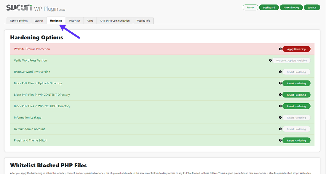 La pestaña de Hardening le permite aplicar un conjunto de métodos estándar de endurecimiento de seguridad de WordPress y PHP. Pero puede usar la configuración de Archivos PHP Bloqueados en la Lista Blanca para omitir ciertos archivos PHP de estas rígidas restricciones.