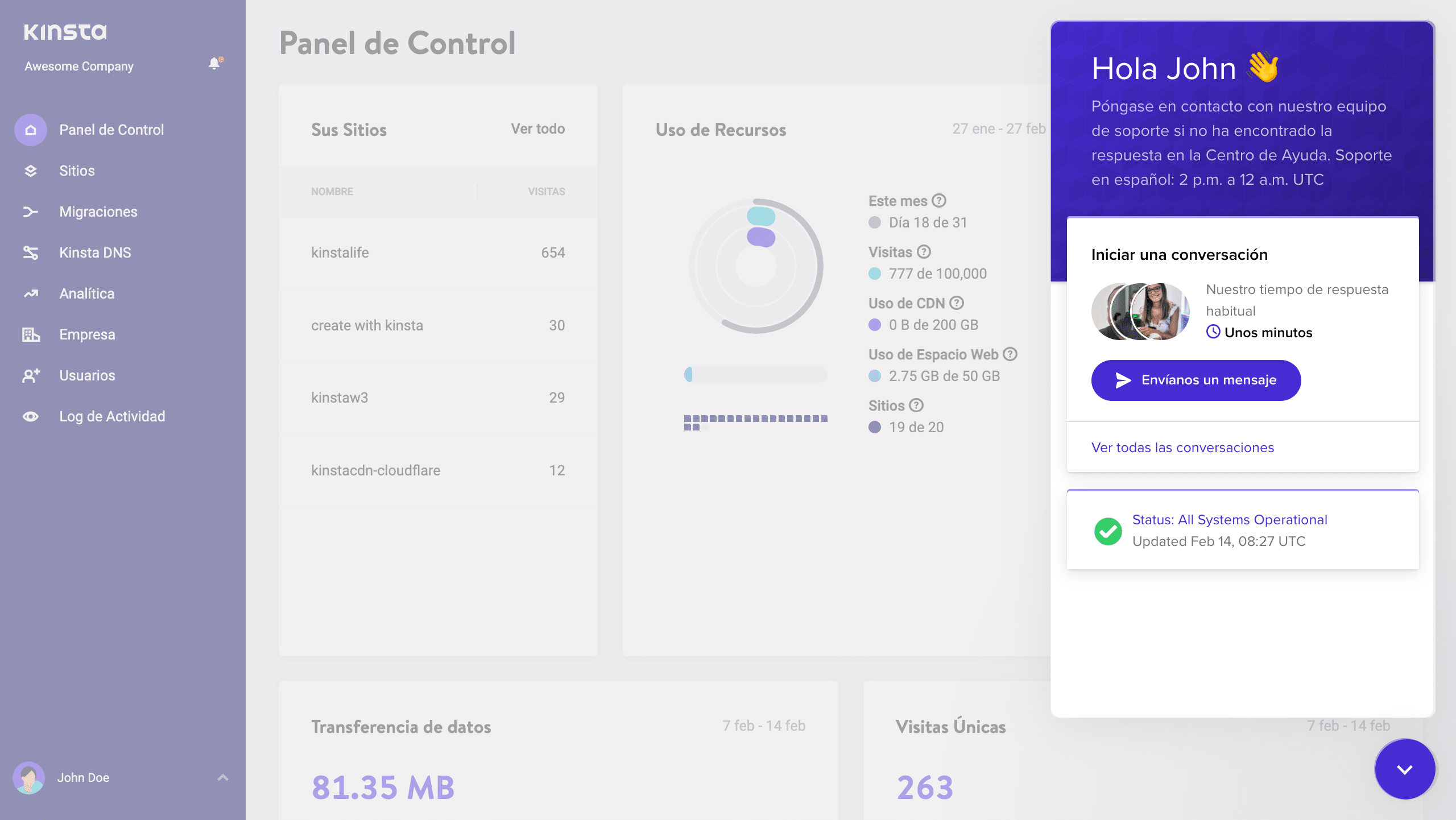 Cada cliente de Kinsta puede chatear los mismos miembros del equipo de soporte que apoyan a grandes empresas y compañías Fortune 500. Un dato curioso, contratamos a menos del 1% de la gente que aplica para entrar a un puesto de soporte en nuestro equipo. ¡Usted no podrá encontrar en ningún otro lado a un equipo más conocedor!