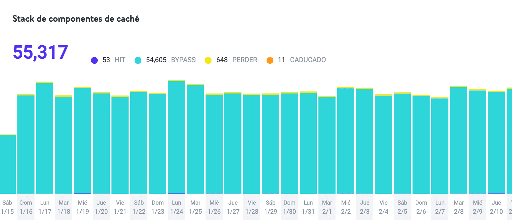 El stack del componente del caché (como se muestra abajo) le permitirá ver el estatus de cada petición, sea un HIT, BYPASS, MISS o EXPIRED. Usted puede filtrar los datos por las últimas 24 horas, 7 días o 30 días.