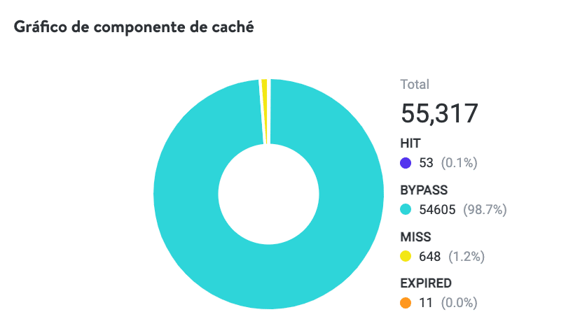 El diagrama del componente de caché le da una idea de su rango de caché. Entre más peticiones usted sirva desde el caché será mejor. Como puede ver en el ejemplo de abajo, este sitio de WordPress tiene un rango de HIT de caché de 96.2%. ¡Y esto es bueno!