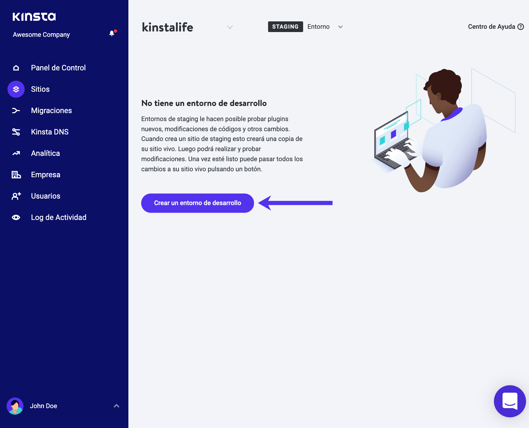 En Kinsta, cada sitio de WordPress viene con su propio entorno de prueba con un clic. Todo lo que tiene que hacer es dar clic en “Crear un Entorno de Prueba” y usted instantáneamente tendrá una copia de su sitio de producción. Esto hace que sea súper sencillo probar cosas.