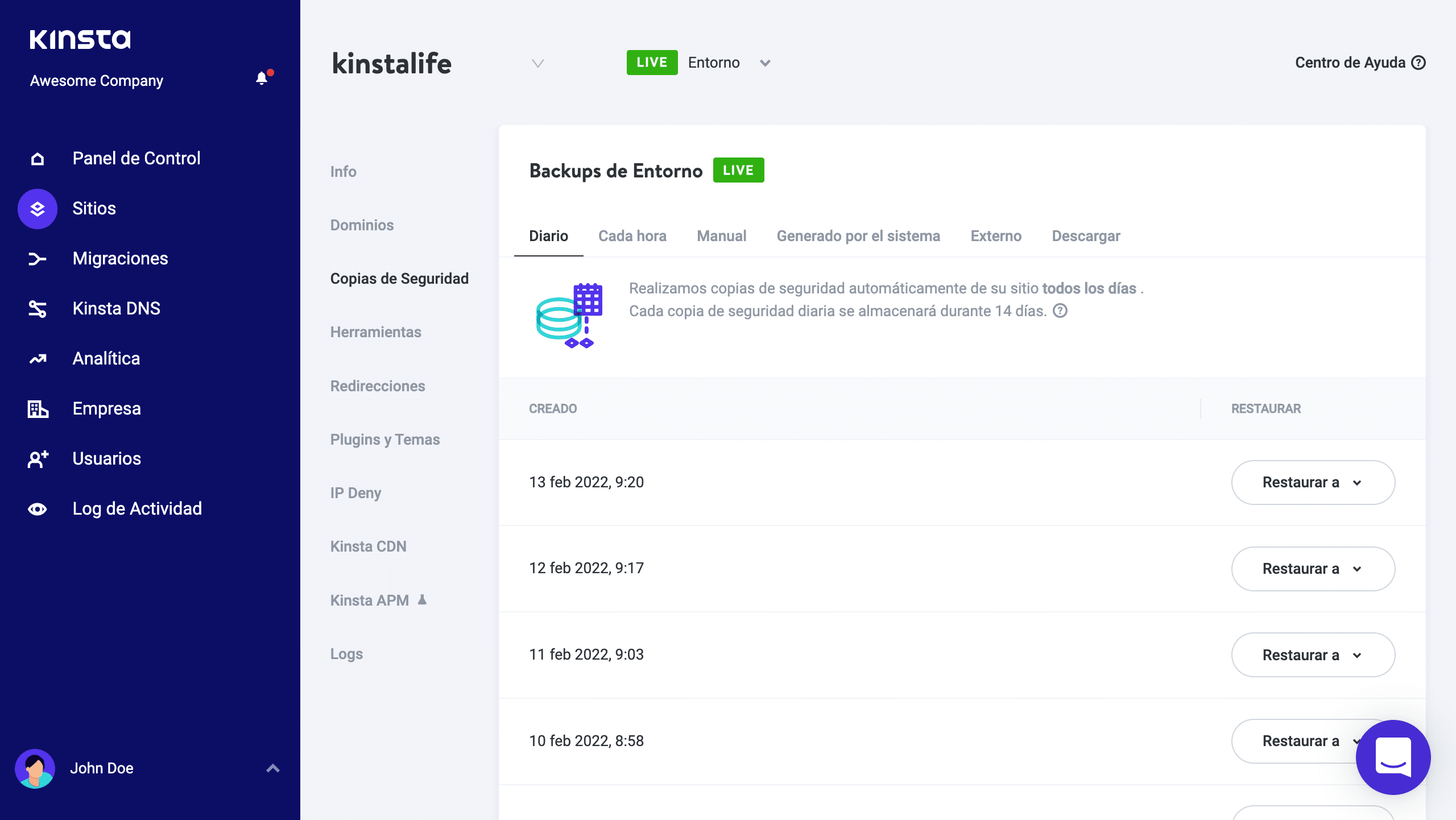 Por esta razón, no hay necesidad de descargar un plugin de respaldo, si es que usted tiene a Kinsta como su host. ? Usted puede restaurar respaldos con el clic de un botón e incluso copiarlos a su entorno de prueba. Mejor aún, Kinsta no incluye estos respaldos en su uso total de disco.