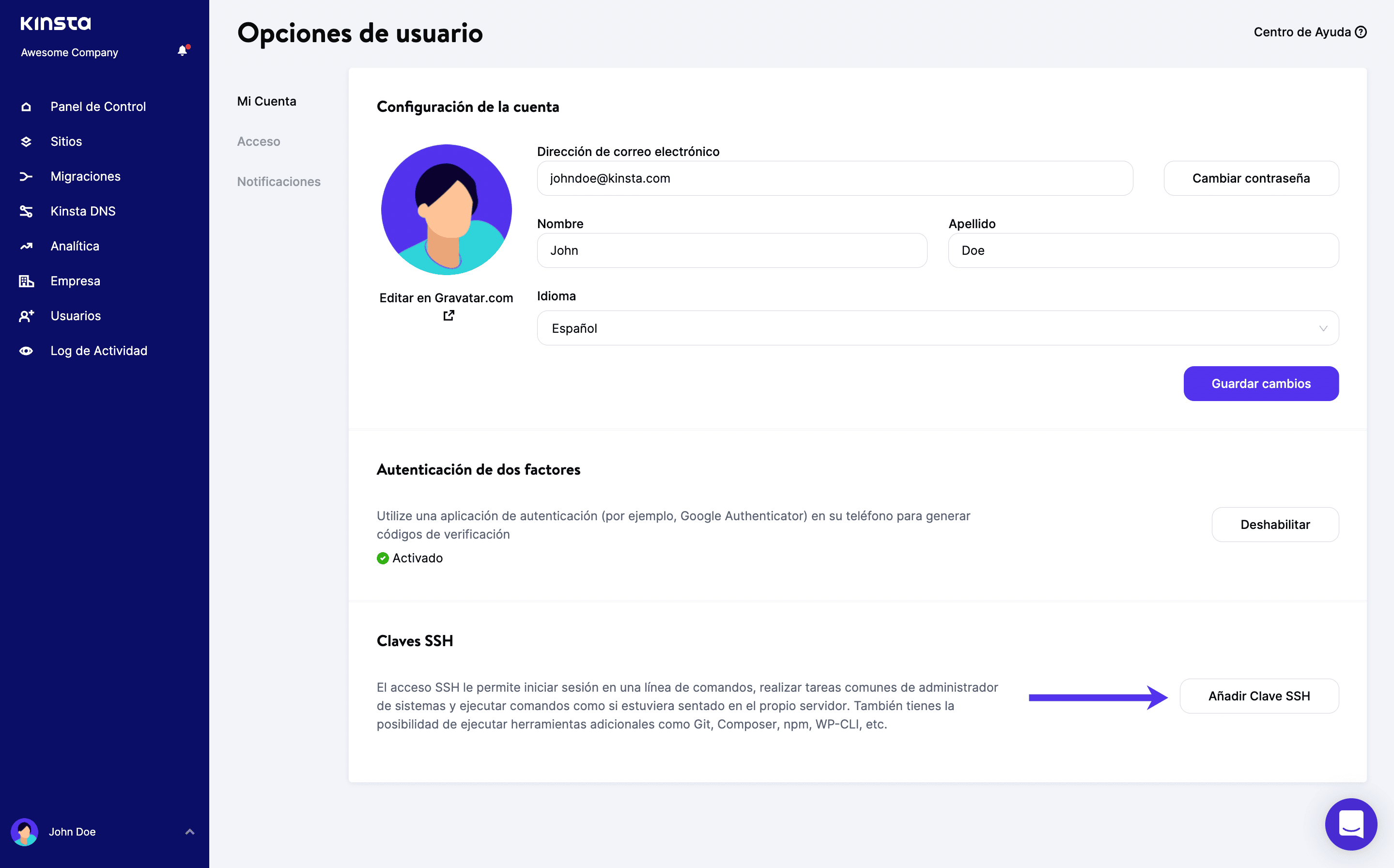Consulta nuestro artículo de la base de conocimientos para obtener más detalles sobre cómo conectarte a SSH en Kinsta y cómo generar tu clave pública.