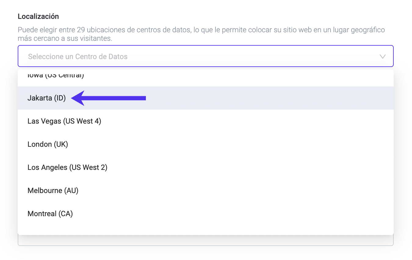 En el panel de control de MyKinsta, selecciona «Yakarta» para la ubicación al crear un nuevo sitio.