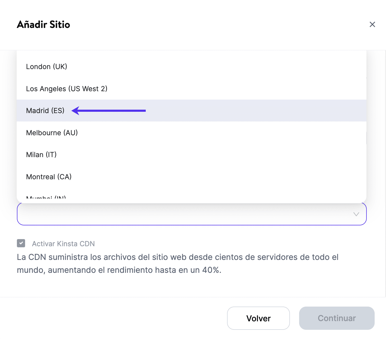 Si quieres establecer Madrid como tu centro de datos en MyKinsta, simplemente sigue estos pasos: